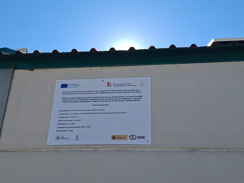 El Ayuntamiento de Palma del Río ha recibido una ayuda de la Unión Europea con cargo al Fondo NextGenerationEU, en el marco del Plan de Recuperación, Transformación y Resiliencia, para Instalación de producción de energía fotovoltaica para autoconsumo con almacenamiento en las instalaciones de la EBAR Barqueta de Palma del Río (Córdoba), dentro del programa de incentivos ligados al autoconsumo y almacenamiento, con fuentes de energía renovables, así como la implantación de sistemas térmicos renovables en el sector residencial del Ministerio para la Transición Ecológica y el Reto Demográfico, gestionado por la Junta de Andalucía, a través de la Agencia Andaluza de la Energía.